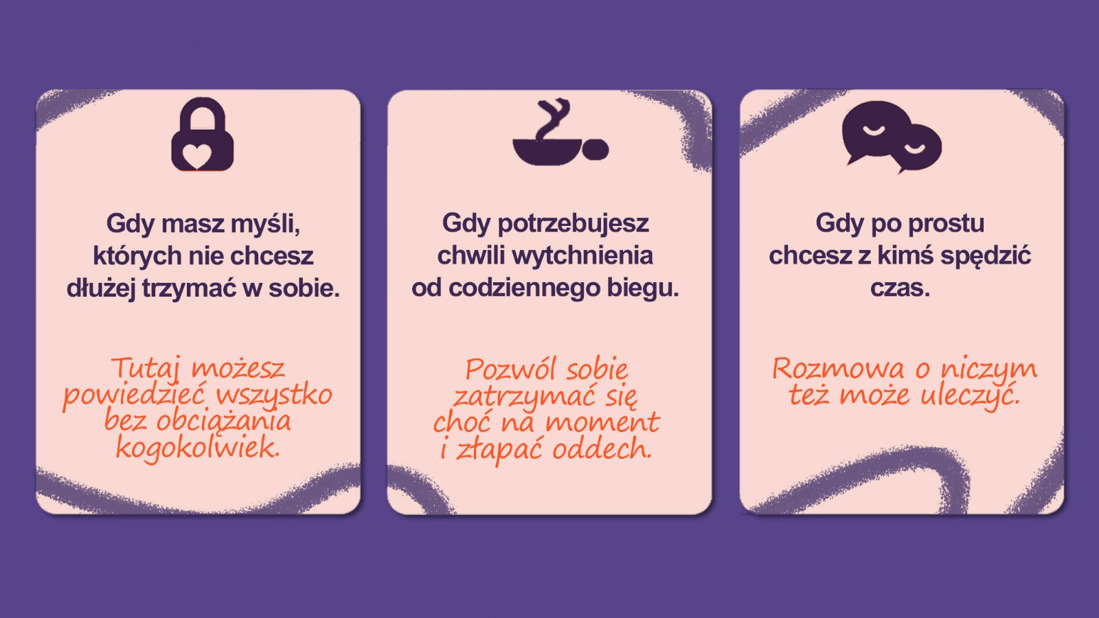 Na chwilę wsparcia i rozładowanie stresu — kiedy jedyne, czego naprawdę potrzebujesz, to ktoś, kto po prostu szczerze Cię wysłucha. Bez oceniania, bez pośpiechu, bez dorabiania teorii. Czasem wystarczy rozmowa, by poczuć ulgę, uporządkować myśli i odzyskać spokój. Tu możesz po prostu być sobą i powiedzieć wszystko, co od dawna nosisz w środku.