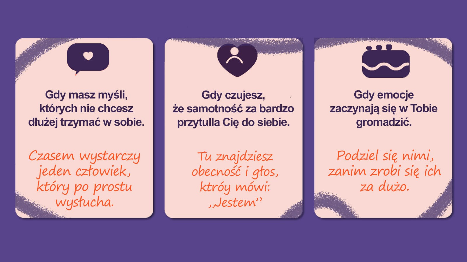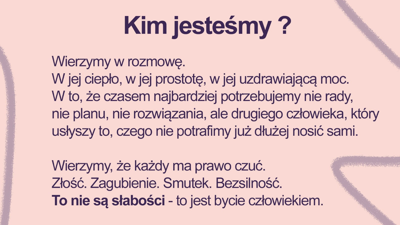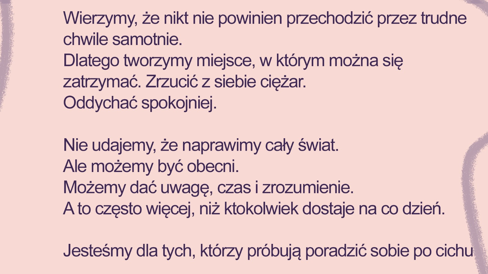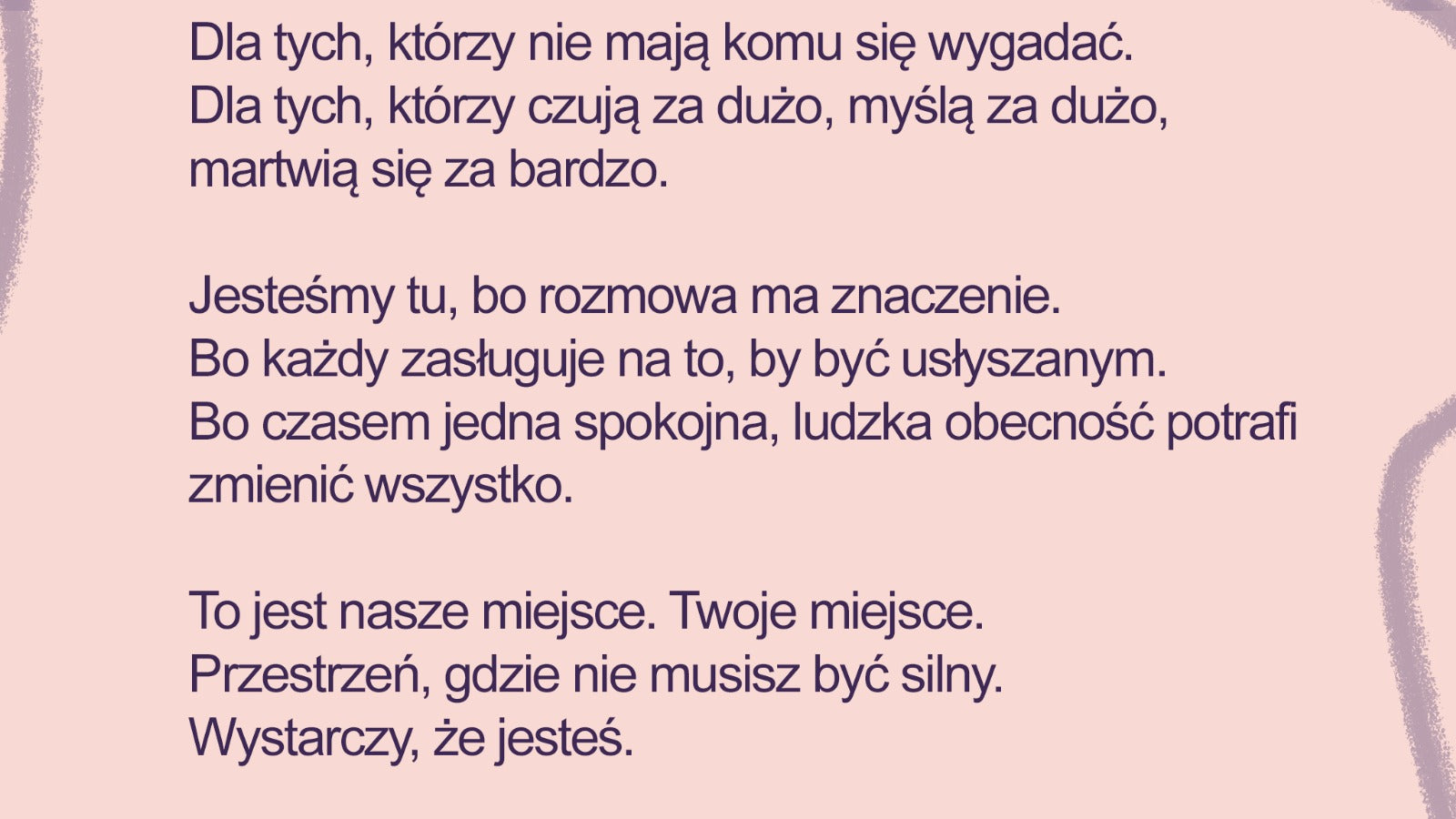 Kiedy czujesz ciężar na sercu. Kiedy potrzebujesz zrozumienia. My jesteśmy po drugiej stronie — gotowi wysłuchać, odpowiedzieć i dać Ci poczucie, że nie jesteś sam. Niezależnie od tego, czy to drobiazg, czy coś, co nosisz w sobie od dawna, możesz napisać i znaleźć tu spokojne, życzliwe miejsce do rozmowy.